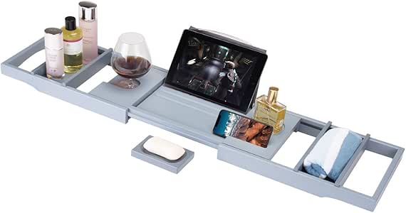 Dalaier expandable bathtub tray,adjustable bathtub caddy tray and organizer for book/wine/phone,washing colander pp+tpr bathtub tray, bath caddy tray for tub, unique bath accessories and bath trays, your ideal bath tub accessories for adults, stylish bathtub. Bamboo bath caddy is the most common choice when it comes to bathtub caddies. The tray is capable of holding a smart phone/tablet, wine glass and two candles (up to 2 inches in diameter)! *some links on theshowercaddy.com are amazon affiliate links, and if you use them to make a purchase, we check price on amazon. For entertainment, there's a metal frame to prop up your book (or tablet.